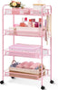 TOOLF 4 Tier Rolling Utility Cart - Durable Metal Design Pink Utility Cart, Storage Trolley on Wheels with 3 Hooks, Perfect for Kitchen, Bathroom & Laundry Room Organization