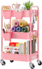 3 Tier Rolling Cart on Wheels, Metal Utility Storage Cart with Wheels, Three Tiered Craft Carts Organizer with Hanging Cups, Hooks, Mesh Basket for Bedside, Kitchen, Bathroom, Office, Art, Snack, Pink