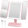 Rechargeable Trifold Makeup Mirror with Lights, 1X/3X/5X Magnification, Cordless 3-Color LED Vanity Mirror for Travel & Desk, Up to 20H Use, Ideal Gift for Women & Teens - Pink