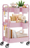 YASONIC 3-Tier Metal Rolling Cart, Heavy Duty Utility Cart with Lockable Wheels, Hanging Cups, Hooks, Mesh Rolling Storage Cart Craft Organizer, Lightweight and Sturdy, Pink